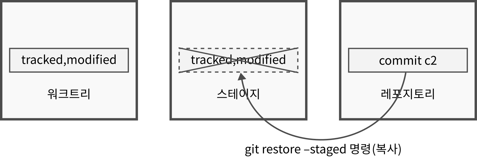 | 스테이징 취소 | - | (2) 스테이지 파일 삭제 | (1) 레포 파일 내용을 이용하여 | git restore --staged |