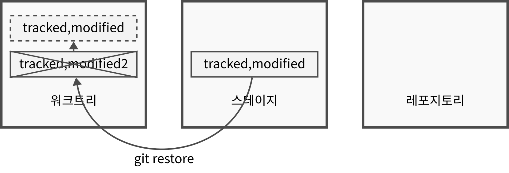 | 워크트리 원복 | (2) 워크트리 파일 원복 | (1) 스테이지 파일 내용을 이용하여 | - | git restore |