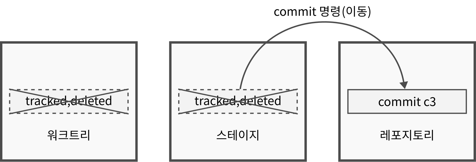 - 이 상태에서 커밋을 하면 스테이지의 삭제 정보가 레포지토리로 들어가서 삭제가 확정된다.