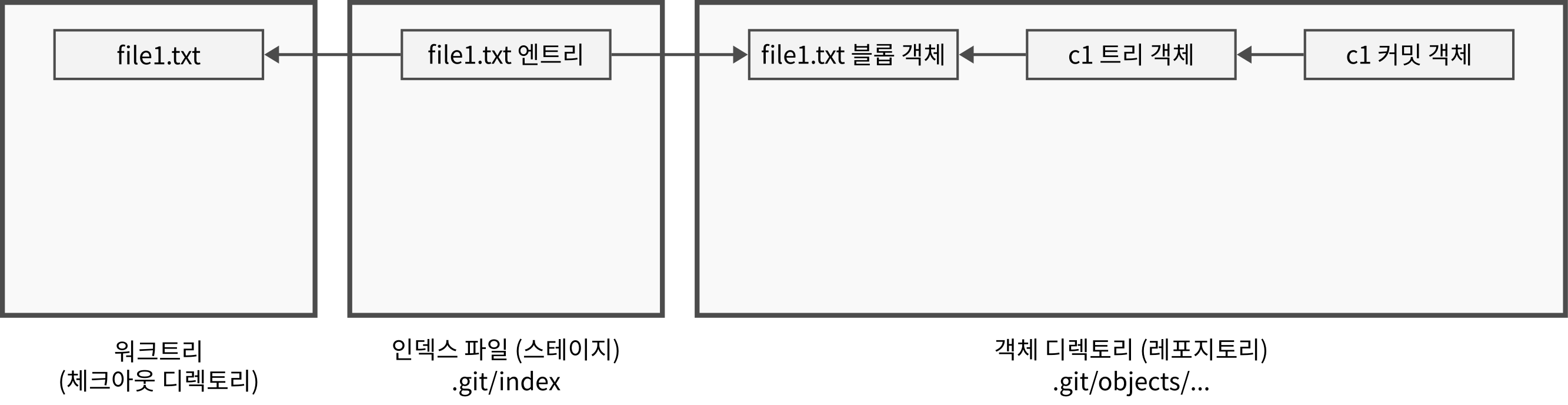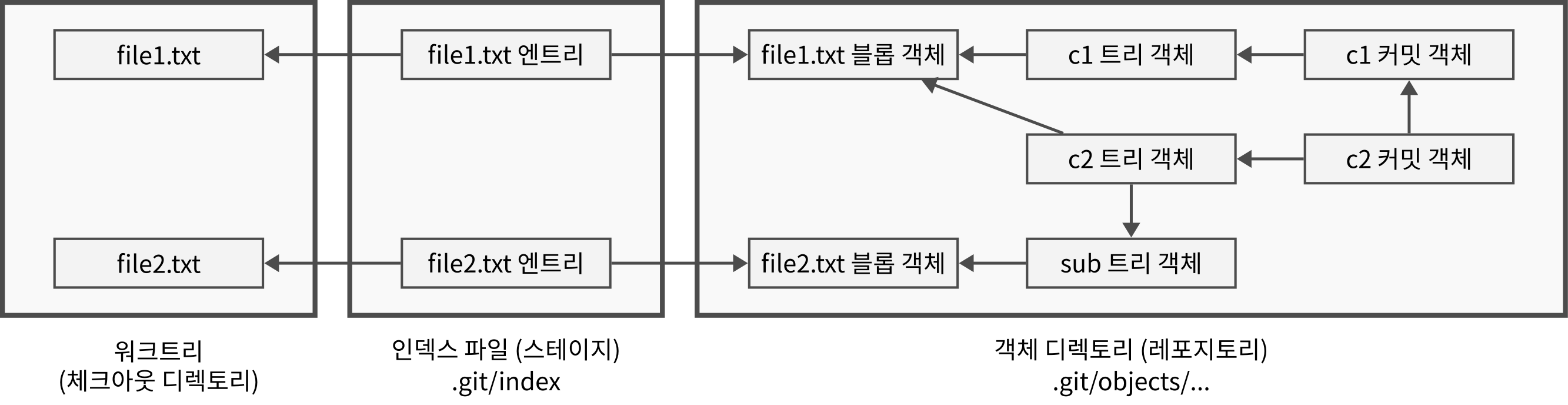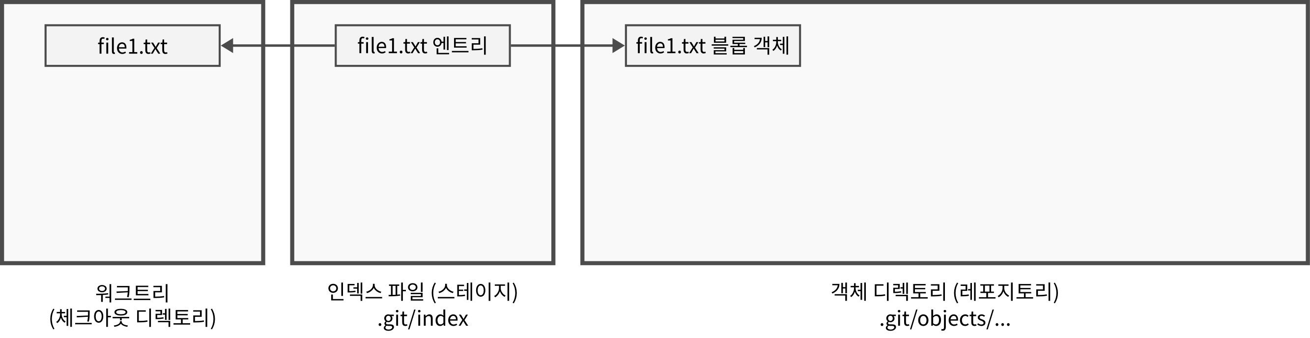 - 파일이 add 명령으로 스테이지에 들어가면 파일의 내용은 블롭(blob) 객체 파일에, 디렉토리의 내용은 트리(tree) 객체 파일에 저장된다.